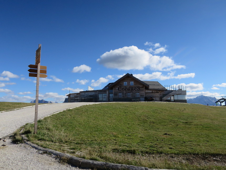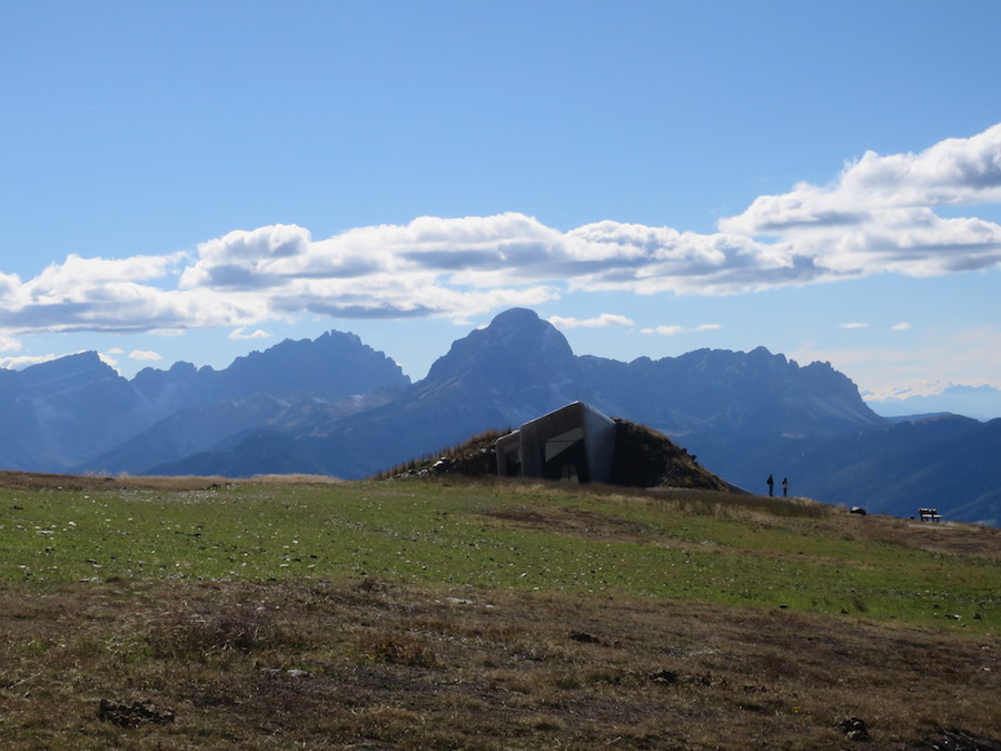 Messner chose Kronplatz to create a space in contrast to the winter skiing and sport hype in general, to provide an attraction and a quiet place at the same time. Mh, but visiting Kronplatz in autumn like I did is not so very nice: construction of paths between the different restaurants going on (only found one restaurant open), dung spread all over the place to rescue the rest of green apparently overused in summer… some Tipis for kids or Native Americans Wanna-Bees (?). And cableways arriving from every side… a mountain sacrificed to sports and tourism…